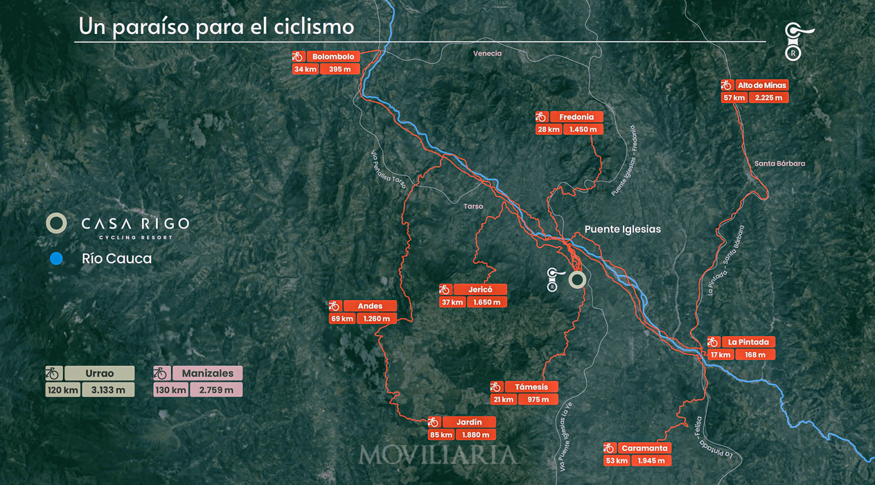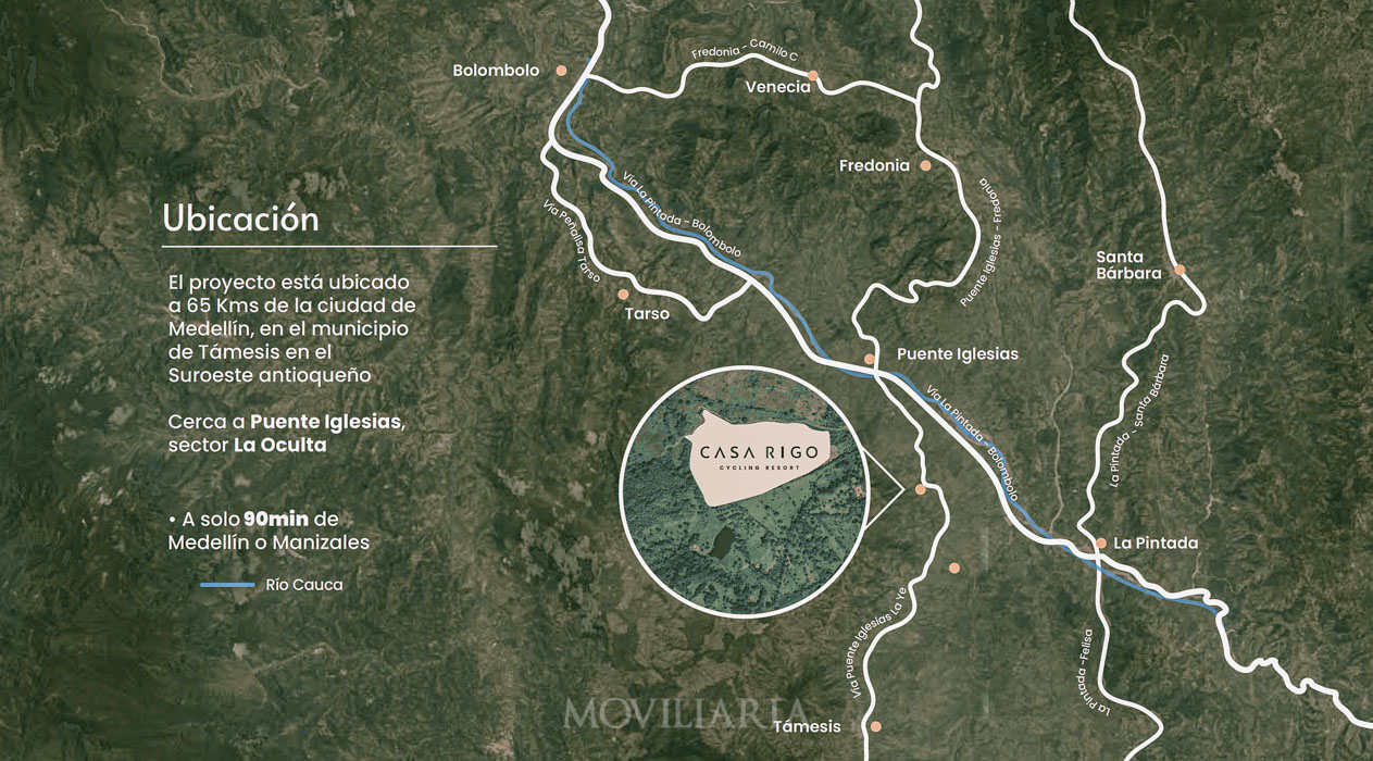 Casa Rigo, en La Oculta, Támesis, es el primer resort de ciclismo en Colombia. Con 60 habitaciones y 25 villas, combina deporte, vida al aire libre y confort familiar. Inversión vía derechos fiduciarios.